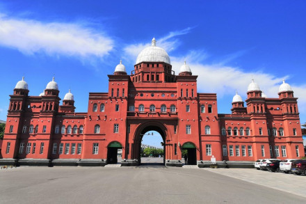 天下第一門是八里河旅游區(qū)的主園區(qū)大門。它綜合了俄、英、美三國的建筑特點,造就了具有八里河藝術(shù)風格的建筑,也是景區(qū)的標志性建筑。這個樓堡式大門共有13個白色圓頂,中間一個較為突出,外墻飾有猩紅色的噴砂。
