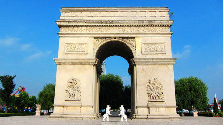 凱旋門是為了紀念拿破侖一世在1805年12月2日的一次戰(zhàn)役中大敗奧俄聯(lián)軍的勝利而建的。在1806年2月12日,根據(jù)拿破侖一世親自批準的計劃,按照著名設(shè)計師戛爾格蘭的設(shè)計圖紙施工,歷時30年,于1836年7月29日竣工。八里河風景區(qū)的雄獅凱旋門是按原建筑的1/3縮小。