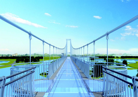 八里河懸空水上觀光玻璃天橋,全長425米,寬3米,全高55米,采用全透明特種玻璃建造,像一條蜿蜒的飛龍盤旋在八里河水面之上。將9D聲光電碎彩屏、花鳥游魚立體特效等流行科技元素與橋面結(jié)合震動,同時還有音效。 |