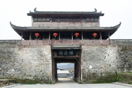 南譙樓,始建于隋末,為歙州(今徽州)人汪華吳王府外子城的正門門樓。南譙樓是古代夜間向人們報時的地方,打更的鼓聲就是從譙樓傳向四面八方的。南譙樓三重三開間,高約20米,寬約15米,進深約10米。磚木結(jié)構(gòu),懸山頂,重檐高脊,紫墻青瓦。下為門厥,門闕寬4.5米,左右各有木柱13根。每根柱圍1米余,每柱均呈10度左右斜倚墻壁,用以支撐大梁。1997年,國家文物局撥款重建,并基本保持了木構(gòu)清代風格,門闕為宋代風格。