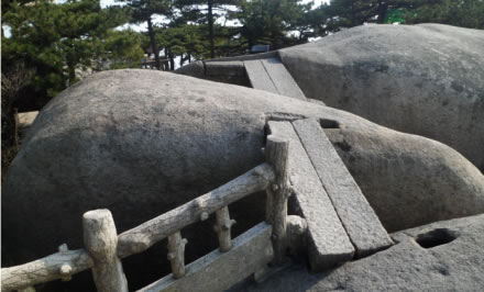 天池峰,為天柱山的第二高峰,它稍高于飛來峰,海拔1426米。天池峰,一裂為三,由兩段石條連接在一起,稱為“渡仙橋”,登上天池峰頂,可觀日出、云海、佛光、晚霞景觀?邕^渡仙橋,即達(dá)方圓不足10平方米的一平臺,臺中大小兩個石坑,稱“天池”。天池平臺外沿是懸崖絕壁,稱試心崖。試心崖可觀賞“天柱山佛光”景觀。