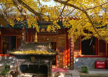 此為八大處一大勝景。霜秋一到,三山之上的黃櫨樹、火炬樹、元寶楓以及柿子樹、核桃樹和山花椒等等,黃時薄山碎,金迎風閃爍,紅時又如二月鮮花處處流丹。有橡樹、青松翠柏,赤橙。