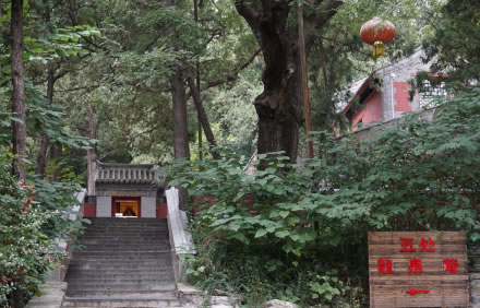 出秘魔崖,沿證果寺門前小盤道下行至南面水井,此處樹木成林,茂密非常,且均高大參天。日出東坡,光照林梢之時,愈發(fā)覺得明暗濃淡別有意趣。唐詩所詠:“清晨入古寺,初日照高林”似不啻此處之景。