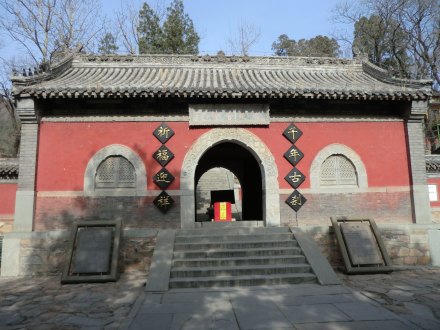 大悲寺的首層建筑是山門殿,硬山正脊灰筒瓦頂。檐下飾有丹青彩畫,殿脊正中裝飾“百鳥朝鳳”磚雕圖案。正檐下嵌有一方漢白玉寺額,上面鐫著“敕建大悲寺”五個大字,字體健勁,是康熙皇帝御筆。寺額下是漢白玉券門,自下而上對稱浮雕白象、雄獅、騰龍、翔羊;門楣正中雕飾著三尊神像,正中一尊人面鳥喙,是佛經(jīng)中大鵬金翅鳥的應化形象。券門兩旁是石雕花窗,飾有蘷龍和忍冬草花紋,優(yōu)美而莊重。兩側正脊門樓造型也很精致。