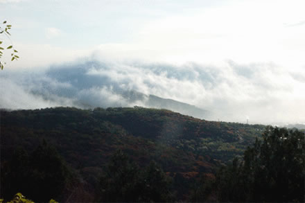仲夏清晨,雨后天氣濕潤時,?梢娙缢厝缇毜脑旗F飄浮于三山之腰,似斷還連的畫中之境。注目靜觀,或自峰后繞于嶺前,或從石隙游出升騰;有時凝固不甚流動,有時行走又很疾速。翠微山、虎頭峰間凝然不動者居多,盧師山青石黛樹中則流走如飛者眾。概山勢高低不同所致。