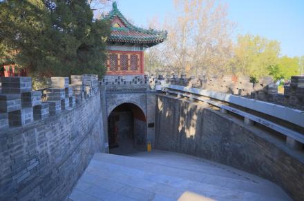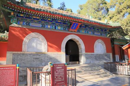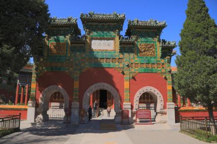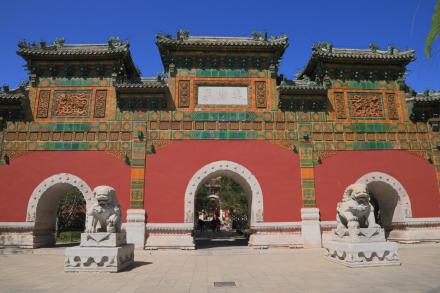 智珠殿,半月城位于瓊島東麓山腳下,座西面東與陟山橋相對(duì),建于乾隆十六年(1751年)。智珠殿建在半月城城臺(tái)上,紅墻綠瓦,四面有五個(gè)牌樓相對(duì),中軸對(duì)稱(chēng)、布局別致是中國(guó)古建筑中比較少見(jiàn)的,殿內(nèi)原供奉文殊菩薩一尊。