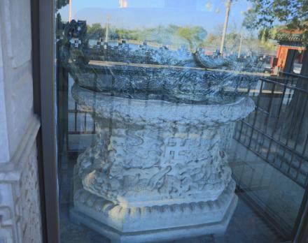 玉甕又稱(chēng)“瀆山大玉!,制作于至元二年(1265年)?诔蕶E圓形,通高70公分,周長(zhǎng)493公分,重約3500公斤,周身浮雕海龍、海馬、海豬、海犀等出沒(méi)于波濤之中,栩栩如生。元世祖忽必烈曾將玉甕放置瓊?cè)A島廣寒殿中,傳說(shuō)曾用以盛酒大宴群臣。明代廣寒殿倒塌,玉甕失落民間。清乾隆十年(1745年)發(fā)現(xiàn)后,乾隆皇帝“令以千金易之,置承光殿中”,乾隆十四年(1749年)建玉甕亭,將玉甕陳設(shè)于亭中配以漢白玉雕花石座,命翰林四十人,各賦詩(shī)一首,刻于亭柱之上。