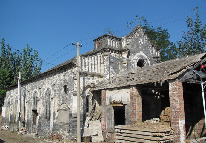 太和莊天主教堂 太和莊天主教堂,創(chuàng)建于民國三年(1914年),解放后即棄置不用。坐北朝南,是一座法國天主教教堂建筑,是房山區(qū)最早建立的教堂,也是房山區(qū)唯一一座保存基本完整的未經(jīng)拆改的教堂。面闊三間,進(jìn)深六間。山墻頭一間兩側(cè)開券門。板瓦頂清水脊。堂內(nèi)有兩排八角磚柱。盡頭設(shè)石供桌,現(xiàn)已無存。