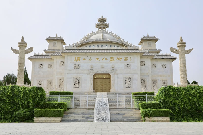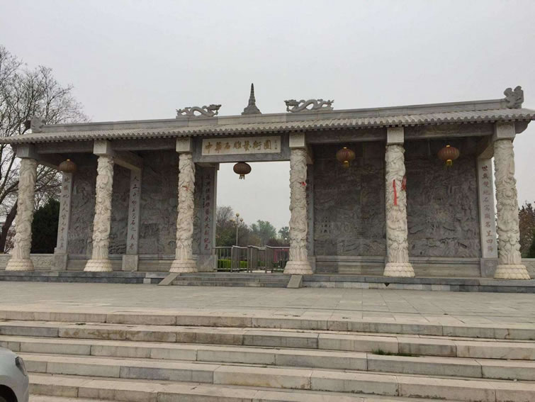 中華石雕藝術園 大石窩中華石雕藝術園位于北京市房山區(qū)大石窩鎮(zhèn)。園區(qū)面積2400畝,園區(qū)內以石為主。石神、石鼎、石橋、十二生肖各種雕塑均以大理石為原材料,精雕細作而成,充分突出了石雕的藝術特色,是北京地區(qū)最大的石雕主題公園。漢白玉藝術宮位于中華石雕藝術園內,于2002年2月份動土施工,建筑面積2200平方米。工程的用料全部采用質地精良的漢白玉石材,共使用漢白玉石料740多立方米。藝術宮高27米,最高端是一座棲賢亭,下面是一個半球型的漢白玉天棚,天棚的東、南、西、北、東南、西南、東北、西北方向各有一條漢白玉脊龍,天棚下端是由36根漢白玉側柱組成的圓柱型建筑,宮門的正上方是長方形的漢白玉牌匾題有雕塑書法大師錢紹武提寫的“漢白玉石雕藝術宮”。藝術宮四周的漢白玉角柱、立板共280塊,其中鑲有各種圖案的漢白玉浮雕,在藝術宮的東西兩側還開有高4.4米的九龍漢白玉卷拱門。每道門正下方均有一塊好似保和殿前“云龍階石”的御路。