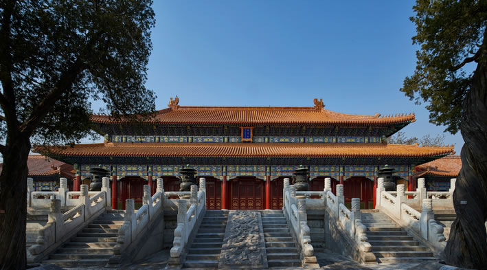衍慶殿:在西。黃琉璃筒瓦歇山調(diào)大脊,面闊3間,進(jìn)深1間,前后帶廊。重昂五踩斗拱,旋子彩畫,四周有石護(hù)攔。