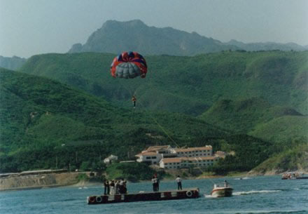 由泰國引進(jìn),跳傘平臺設(shè)在湖中,長40米,寬25米,總面積1000平方米。平臺浮在湖面上,由鐵錨固定在湖心。傘衣有兩種,可以根據(jù)游人的體重大小分別選用。游人在跳傘之前,平臺上穿好救生員和傘衣,傘衣由兩條高強(qiáng)度尼龍繩與傘和快艇相連,在快艇的高速牽引下,傘張開把人帶至空中,最高可達(dá)50米。隨著快艇的方向和速度,傘在空中時高時低,迂回曲折,在藍(lán)天碧水之間翱翔,湖區(qū)景色盡收眼底.