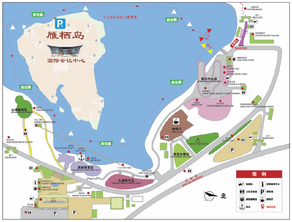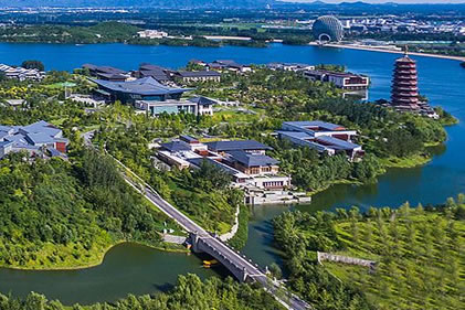雁棲島上 核心是 雁棲湖國際會議中心。服務(wù)于大型會議。建筑主體是 “漢唐飛揚(yáng)”,前面是夏園?偨ㄖ娣e4.2萬平方米,大小會議室、餐廳20余間,可以同時滿足近千人舉行會議和用餐。會議中心建筑內(nèi)部以H型為布局,功能核心區(qū)由位于一層的宴會廳——“鴻雁廳”和位于二層的會議大廳——“集賢廳”組成,兩側(cè)為貴賓大廳、休息區(qū)、大小會議室、包間等功能空間,宴會廳南側(cè)設(shè)室外宴會草坪,可以舉辦室外酒會等活動。