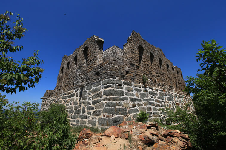 九眼樓長城 九眼樓長城位于四海鎮(zhèn)火焰山頂部。因敵樓每面有9個箭窗,故名。又因山勢高峻,晴天可望到北京城,故也稱望京樓。為長城重要關(guān)口之一。海拔1141米,F(xiàn)樓內(nèi)有灶炕、居室遺跡,近處有馬場、晾馬場、軍營(營城)遺跡。樓北側(cè)有明代官員徐申于萬歷十三年(公元1585年)巡行到該地書寫的大理石碑一方。 九眼樓為正方雙層建筑,因每邊有九個了望孔而得名,現(xiàn)存一層,高度為7.8米,每邊為13米,了望孔高1.65米,寬0.5米,內(nèi)有軍士來往巡視寬1.2米的環(huán)行步道。九眼樓下部砌石條,上部用白灰砌青色城磚,構(gòu)建十分堅固而壯美。樓下西側(cè)有小平臺,為軍士集中的場地。平臺北側(cè),有磚砌的臺階,沿臺階可達樓南門。樓頂為磚砌券拱式結(jié)構(gòu),樓內(nèi)寬大,可住兵儲器,向北開兩窗,四面各有一門,門高兩米,闊1.2米,出入極便利。 |