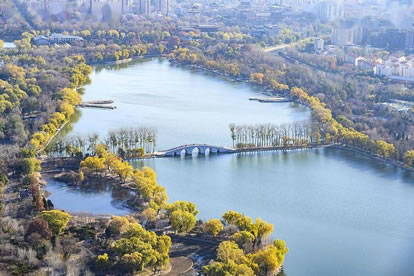 引水湖在公園東北部,有一幽靜湖區(qū),原來為林木囤養(yǎng)區(qū),植被繁茂。隨著公園環(huán)路的建設(shè),這個(gè)占地9.5公頃,地勢(shì)低洼的林區(qū),在1997、1998年被大規(guī)模回填改造。該景區(qū)的水系是自東湖而來,至釣魚臺(tái)而去。北部地形舒緩開闊,以雪松,銀杏和挺拔的白楊等喬木為主,散布于開闊的草坪,沿公園環(huán)湖路北,配以海棠等春花灌木帶,極具90年代的疏林草地風(fēng)格。