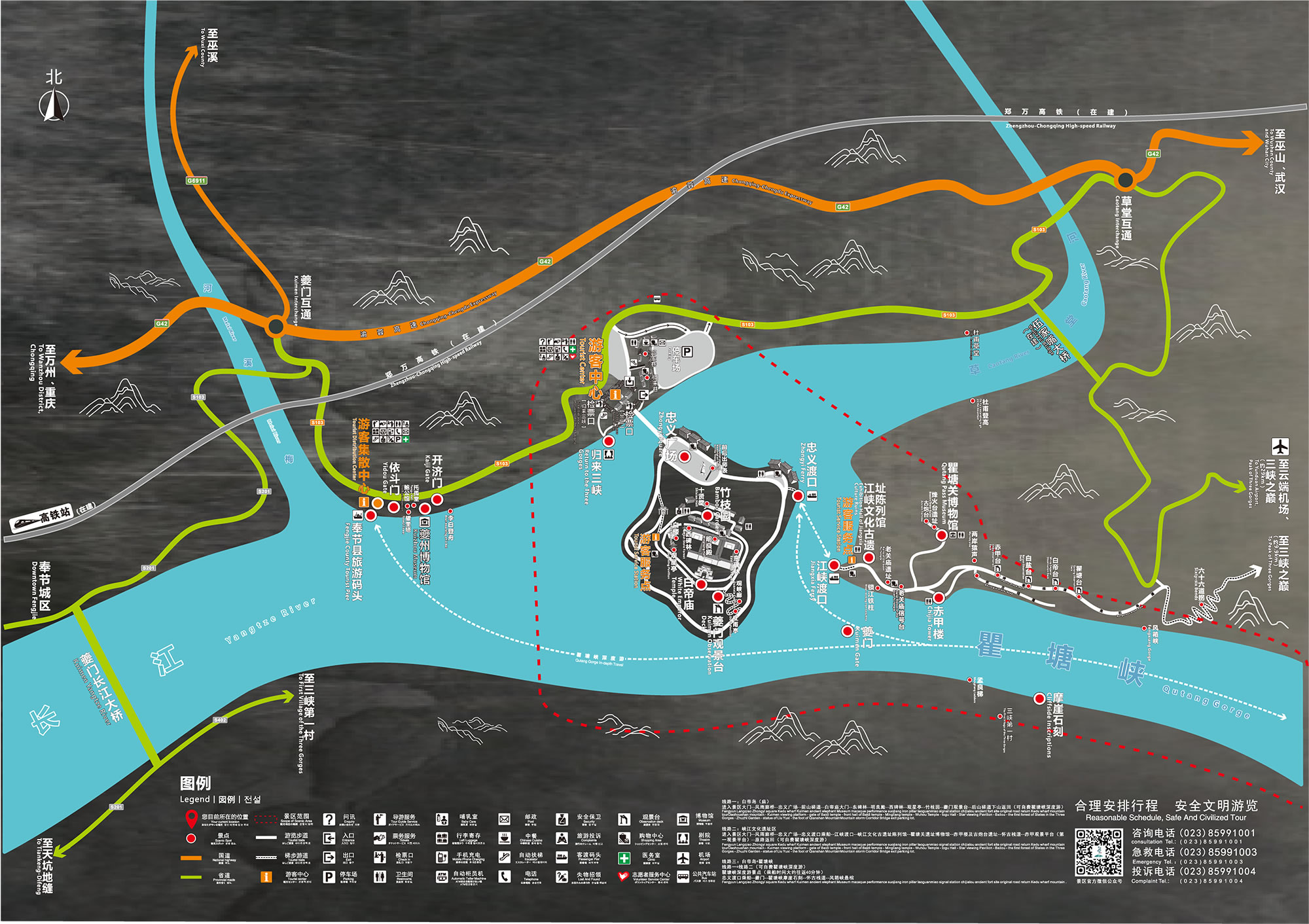 白帝城·瞿塘峽景區(qū)總面積4.7平方千米,主要由白帝城、瞿塘峽兩大景區(qū)構(gòu)成,名勝古跡眾多,融自然與人文、詩(shī)情與戰(zhàn)火為一體,是飽覽長(zhǎng)江三峽壯麗之美的起點(diǎn)。白帝城擁有多座城門,發(fā)現(xiàn)的有東門、小北門、大北門、皇殿臺(tái)甕城門(桑閤門)、小西門、西門等,白帝廟內(nèi)有明良殿、武侯祠、觀星亭等明清建筑。 瞿塘峽緊鄰白帝城,全長(zhǎng)8千米,集雄、奇、險(xiǎn)、峻為一體,是三峽中最短、最窄、最險(xiǎn)的一段峽谷。瞿塘峽內(nèi)北岸赤甲山上有老關(guān)廟文化遺址、大溪文化遺址、巫山猿人遺址三大遺址和老關(guān)廟信號(hào)臺(tái)、赤甲樓、古炮臺(tái)、古棧道、風(fēng)箱峽懸棺等景點(diǎn);南岸白鹽山有孟良梯古棧道遺跡、摩崖石刻、犀牛望月峰、猿人峰等景觀,濃縮了中國(guó)200萬(wàn)年的人類發(fā)展史。