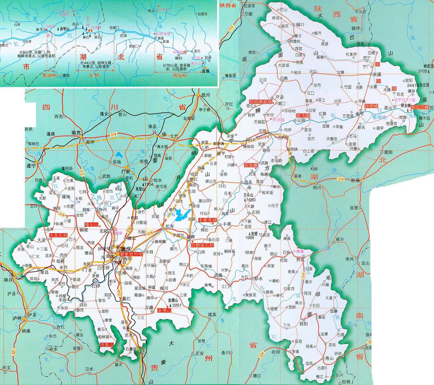長江斜貫本市,形成著名的長江三峽。中亞熱帶濕潤季風(fēng)氣候,年降水量1000毫米以上。冬暖夏熱,夏季因地形郁悶,氣候悶熱,成為長江三大“火爐”之一。