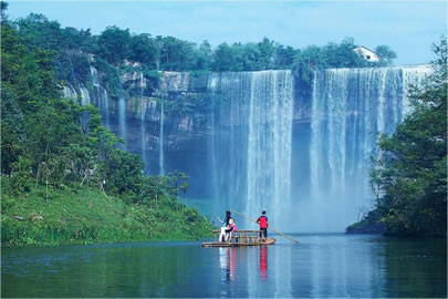 萬(wàn)州大瀑布又稱青龍瀑布、甘寧瀑布。位于核心景區(qū)青龍河中段,寬151米,高64.5米,單掛面積9739.5平方米,為迄今發(fā)現(xiàn)的亞洲面積最大的單掛瀑布。瀑布長(zhǎng)年浩浩蕩蕩,凌空飛瀉,其勢(shì)如千軍萬(wàn)馬橫空出世,氣吞萬(wàn)象。在陽(yáng)光的照射下,瀑珠時(shí)時(shí)生輝,瀑霧處處成虹。隨著水勢(shì)大小、陽(yáng)光強(qiáng)弱、觀賞角度的變換,彩虹的位置、形態(tài)、色澤還會(huì)發(fā)生奇異的變化,形成“飛瀑斜虹”“臥波長(zhǎng)虹”“雙曲彩虹”“跨岸飛虹”“水簾霓虹”“飲洞巨虹”等美景。