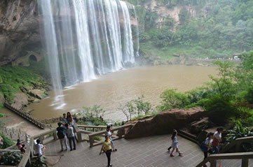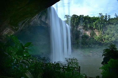 水簾洞位于瀑布下方,由整塊的巨巖組成。巨巖由砂巖青石構(gòu)成,面積有上萬(wàn)平方米。水簾洞內(nèi)能以360度的全景視角觀賞到大瀑布“飛流直下三千尺,疑是銀河落九天”的恢宏氣勢(shì),體驗(yàn)與瀑布親密接觸的清爽,領(lǐng)略春雨瀟瀟、秋雨綿綿、夏雨磅礴的四季風(fēng)雨情致,有奇妙的季節(jié)穿越之感。
