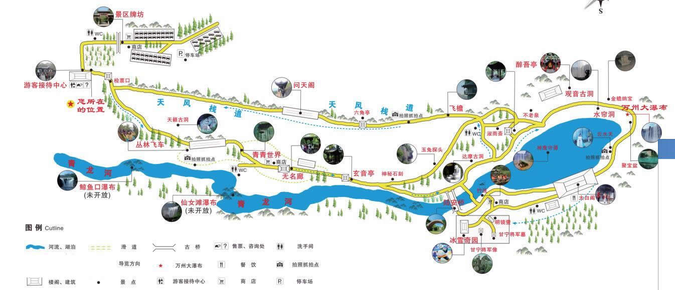 重慶萬(wàn)州大瀑布群旅游區(qū)山青、水秀、瀑寬、洞奇、潭幽、湖大、虹美,共有大小景點(diǎn)50多個(gè)。大瀑布群呈三級(jí)梯級(jí)瀑布群,沿青龍河由上而下至瀼渡長(zhǎng)江口,分別有萬(wàn)州大瀑布、仙女灘瀑布、鯨魚口瀑布,全長(zhǎng)約12千米,對(duì)外開放的是萬(wàn)州大瀑布核心景區(qū)。還有甘寧將軍墓(衣冠冢)、甘寧將軍塑像、醉吟廊、何其芳故居等人文景點(diǎn)。