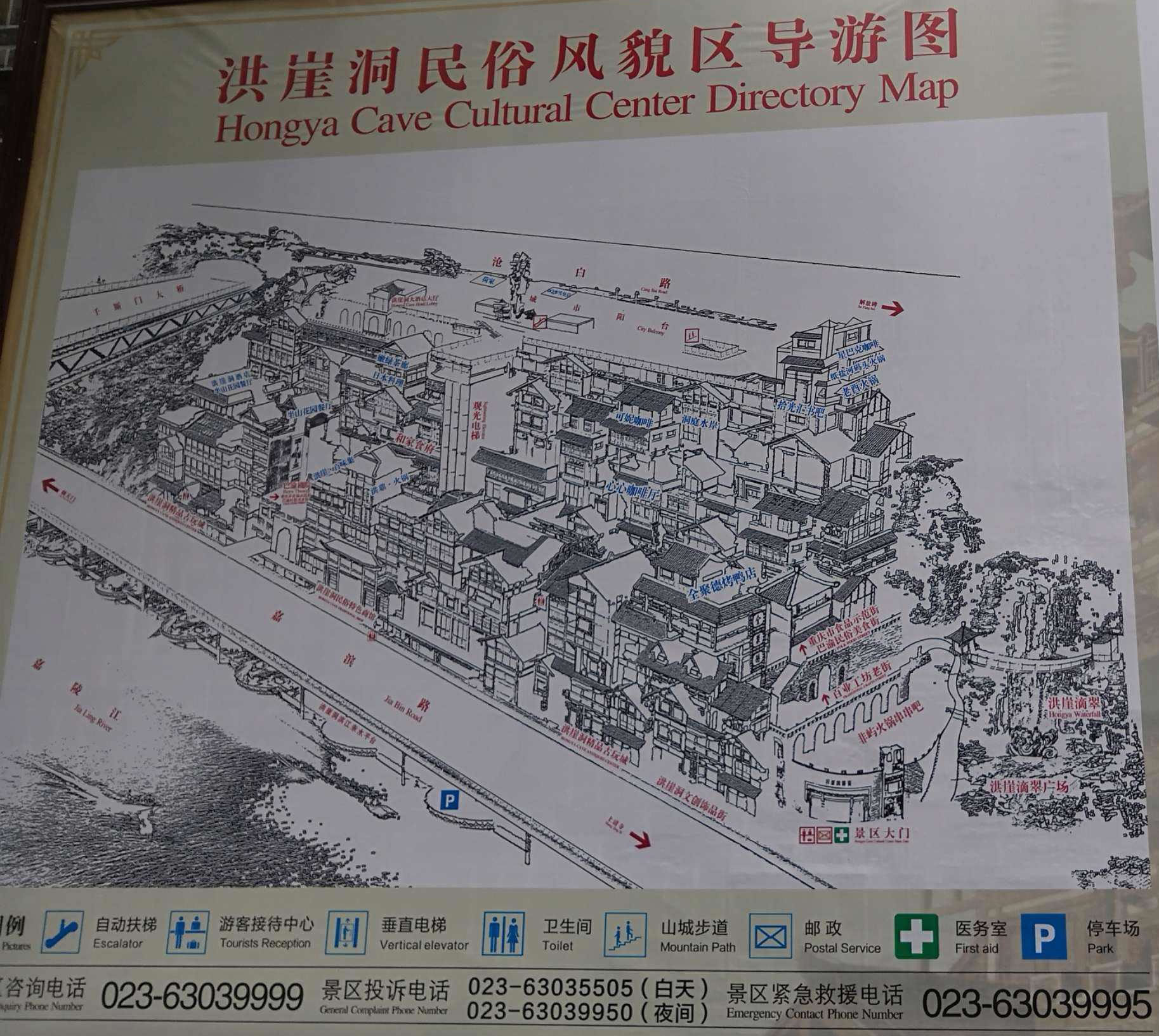 洪崖洞民俗風(fēng)貌區(qū)長約50米,總占地面積3.15萬平方米,分為紙鹽河精品古玩街、天成巷百業(yè)工坊老街、洪崖洞巴渝民俗美食街、洪崖洞異域美食街。有特色餐飲、休閑娛樂、巴渝民間工藝品、特色旅游商品及精品古玩等店鋪。洪崖洞一共有11層,夜晚燈光從晚上6點(diǎn)開燈,10點(diǎn)熄燈?赏跄_群樓觀洪崖滴翠,逛山城老街賞巴渝文化,燙山城火鍋看兩江匯流,品天下美食。形成了“一態(tài)、三絕、四街、八景”的經(jīng)營形態(tài),體現(xiàn)了巴渝文化休閑業(yè)態(tài)!耙粦B(tài)”指的是文化休閑業(yè)態(tài)!叭^”指的是吊腳樓、集鎮(zhèn)老街、巴文化;“四街”指洪崖洞的四條街:動(dòng)感酒吧街、巴渝風(fēng)情街、盛宴街美食街、城市陽臺(tái)異域風(fēng)情街。四條大街分別融匯了時(shí)尚元素,主題迥異特色鮮明。成為重慶娛樂生活、夜生活的標(biāo)向!鞍司啊敝傅氖呛檠碌未、兩江匯流、吊腳樓群、洪崖群雕、城市陽臺(tái)、巴文化柱、濱江好吃街、嘉陵夕照。