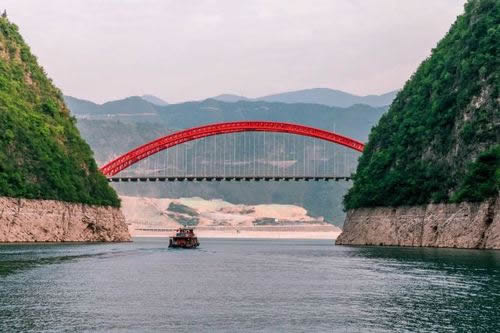 龍門大橋位于小三峽龍門峽峽口,在三峽水庫(kù)最終蓄水后,老龍門大橋主拱圈有三分之二以上部位被淹沒(méi),橋下凈空不能滿足通航要求,因此拆舊橋建新橋。新龍門大橋與巫山長(zhǎng)江公路大橋形成姊妹橋,遙相呼應(yīng)。巫山新龍門大橋位于巫山縣城旁,舊龍門大橋下游90米處的龍門峽峽口。大橋主跨采用240米鋼管混凝土中承式拱橋一跨跨過(guò),路線全長(zhǎng)855.911米。其主要工程量為鋼材2900噸和混凝土1.39立方米。全橋共兩拱肋,每肋13節(jié)段,11道橫撐,采用纜索無(wú)支架吊裝成拱。