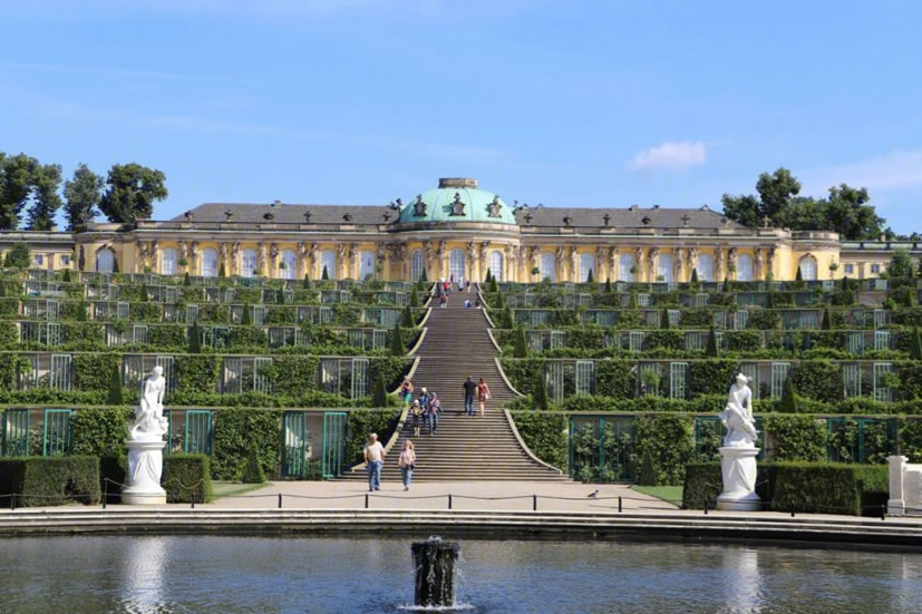 無憂宮 無憂宮(Sanssouci Palace)是18世紀德意志王宮和園林,位于德國波茨坦市北郊,為普魯士國王腓特烈二世模仿法國凡爾賽宮所建。宮名取自法文的“無憂”或“莫愁”。整個王宮及園林面積為90公頃,因建于一個沙丘上,故又稱“沙丘上的宮殿”。無憂宮是18世紀德國建筑藝術(shù)的精華,全部建筑工程延續(xù)時間達50年之久。雖經(jīng)戰(zhàn)爭,但從未遭受炮火的轟擊,仍保存十分完好。 宮殿正殿中部為半圓球形頂,兩翼為長條錐脊建筑。殿正中為圓廳。瑰麗的首相廳,天花板上裝潢富有想象力,四壁鑲金,光彩奪目。室內(nèi)多用壁畫和明鏡裝飾,輝煌璀璨。宮殿前有平行的弓形6級臺階 ,兩側(cè)和周圍由翠綠叢林烘托 。宮殿前有噴泉,正對著大殿門廊。此噴泉采用圓形花瓣石雕,四周有“火”、“水”、“土”、“氣”4個圓形花壇陪襯,花壇內(nèi)塑有神像,尤以維納斯像和水星神像造型精美,形象生動。 據(jù)說整個宮內(nèi)有1000多座以希臘神話人物為題材的石刻雕像。宮殿東側(cè)還有珍藏124 幅名畫的畫廊,這些繪畫多為文藝復(fù)興時期意大利、荷蘭畫家的名作。畫廊寬敞明亮,每逢佳節(jié),這里都舉辦音樂會;▓@內(nèi)有一座六角涼亭,采用中國傳統(tǒng)的碧綠筒瓦、金黃色柱、傘狀蓋頂、落地圓柱結(jié)構(gòu),被稱為“中國茶亭”。亭內(nèi)桌椅完全仿造東方式樣制造,亭前矗立著中國式香鼎。