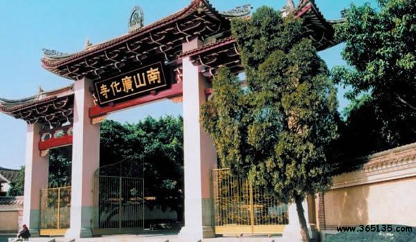 南山廣化寺:座落在城南鳳凰山,F(xiàn)行建筑群是清光緒初年依舊制重修的,從20世紀80年代開始,進行了大規(guī)模的擴建。山門照壁上有中國佛教會已故會長趙樸初題寫的“莊嚴國土,利樂有情”。廣化寺占地3.2萬多平方米,建筑物面積1.7萬平方米。踏入山門,沿著中軸線建筑拾級而上,全長385米。依次是照壁、牌坊、山門、放生池、彌勒殿(天王殿)、大雄寶殿、法堂(上為藏經(jīng)閣)、臥佛殿(下為祖堂);兩側(cè)翼建有寬敞的石柱廊廡,東側(cè)次第為東羅漢殿、鐘樓、五觀堂、伽藍殿、尊客堂、水云鄉(xiāng)、圓通門、溪聲閣;西側(cè)次第為西羅漢殿、鼓樓、學戒堂、祖師殿、凈行堂(念佛堂)、煙霞窟、方丈室、看山樓。寺后東西兩角的最高處,分別聳立著觀音閣和小南山。南山上有幾十株不知年代的蒼松翠柏。