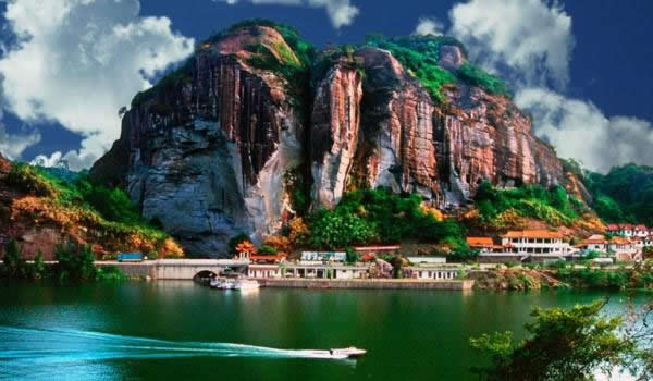 桃源洞因盛產(chǎn)栟櫚樹,古有栟櫚山之稱。風(fēng)景區(qū)起始于唐代,五代后晉年間建有寺廟,到了明代風(fēng)景區(qū)得到較大的發(fā)展。南宋宰相李綱和左正言鄧肅及明代大旅行家徐霞客都曾在此駐足并留有詩(shī)句。明代萬歷年間(公元1605年)當(dāng)?shù)匕采叭藘煽に抉R陳源湛捐資建有亭、臺(tái)、樓、閣十余處,取“世外桃源”之意改名為桃源洞,并在入口處120米高的赤壁上刻有“桃源洞口”四個(gè)大字,從此桃源洞名聞遐邇。這里丹霞地貌形成了眾多的奇峰峭壁,綠海林濤和碧水丹山。