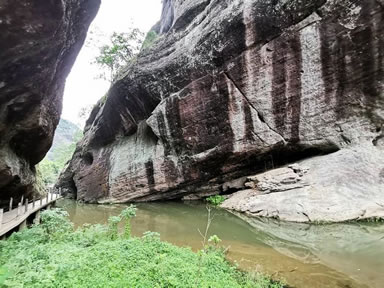 下邊有座石拱橋,長(zhǎng)約4米,寬2米,明萬歷年間,陳源湛所建,是至今保存最完整的古跡之一。巖壁刻有“跨虹橋”三字,因顏如丹色,形狀似彩虹而得名。