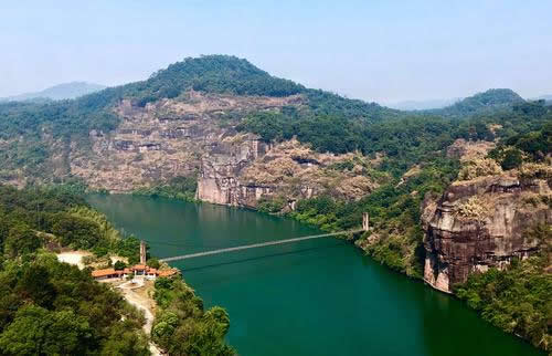 特殊地貌形成兩邊懸崖對(duì)峙,這條小澗叫桃花澗,從景區(qū)深處流出,我們的游路也將沿著高山峽谷的縫隙向內(nèi)延伸。桃源洞本沒有“洞”,無論是步行,還是泛舟游覽,都給人一種洞口的感覺右壁的懸崖高達(dá)120米,“桃源洞口”四個(gè)大字刻在36米高處,是明萬歷年間,辭官回永安的名士陳源湛于1605年所題,每字兩米見方。