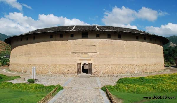 二宜樓:這座被譽(yù)為"國(guó)之瑰寶"的圓土樓,座落在華安縣仙都鎮(zhèn)大地村。仙都、大地,這是多么富有詩(shī)意的名字,其實(shí)二宜樓就是人間天堂的一座民居,就是中華大地的一顆璀璨明珠。 二宜樓依山傍水,樓后峰巒疊嶂,近處山丘綿延,猶如蜈蚣緩緩爬行(風(fēng)水先生稱之為"蜈蚣吐珠地");兩條清澈的小溪在樓前交匯后,直奔西南而去。青山綠水,與黃墻黑瓦交相輝映,小橋、樓閣、翠竹、村舍點(diǎn)綴其間,渾然一體,正是"宜山宜水"的一派旖旎風(fēng)光。樓內(nèi)祖廳便有一對(duì)柱楹,專門(mén)概述這一景觀:"倚杯石而為屏,四峰拱峙集邃閣;對(duì)龜山以作案,二水瀠洄萃高樓。" 所謂宜山宜水,其實(shí)還隱寓樓主蔣仕熊排行第二,又是第二次擇地,才選中這蜈蚣吐珠穴位,其得意之情溢于言表。在族人的傳說(shuō)里,蔣仕熊年輕時(shí)是個(gè)種田能手,他身材高大,體格健壯,臂力超人,能使一把廿四斤重的大刀,可惜他人才超群,卻遲遲未能成家,說(shuō)是犯了"孤鸞命",注定一輩子打光棍。族人背地里取笑他說(shuō):"無(wú)某(妻)無(wú)猴,鎖匙掛褲頭。"他一氣之下出走他鄉(xiāng),到安溪、漳平等地開(kāi)墾荒田幾百畝。不久,他遇到了一個(gè)魏氏姑娘,兩人婚配后,生了六個(gè)兒子。蔣仕熊晚年衣錦返鄉(xiāng),開(kāi)始投巨資建樓,由于操勞過(guò)度,他在二宜樓尚未建成時(shí)便不幸逝世,他的六個(gè)兒子、十七個(gè)孫子繼承遺志,艱苦努力,終于在清乾隆35年(1770年)把大樓建成。