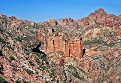 大西天景區(qū)位于冰溝景區(qū)的中部,主要景觀為三個宮殿式丹霞山體,包括約2公里的游步景段和2公里的公路景段。游覽路線為從游步景段北去后,再從公路景段南回,形成一個總長約4.5公里的環(huán)線,整個景線需2小時的游覽時間。主要景點有祁連火炬(奧運火炬、左旋法螺、冰激凌)、鎖陽神柱、鷹頭巖、金鴕情深、盧浮魅影(極樂宮)、埃及法老、蘑菇石、毛主席半身像、金蟾觀霞(金蟾望月)、啤酒屋、孔雀石(佛母金剛)、琉璃宮、娑婆宮、神龜探海(赑屃峰)、靈芝臺、金獅峰(金猊梁)、金剛杵、羊群下山等,其中最有名的當屬神龜探海、金駝情深、鎖陽神柱、鷹頭巖、埃及法老、盧浮魅影、金蟾觀霞等景觀。
