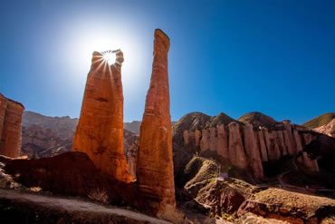 這是冰溝丹霞景區(qū)的又一標志性景觀。兩個并排而立的石柱,高約50米,它是由紫紅色砂巖、礫巖、夾砂礫巖構(gòu)成,在流水沖蝕及凍融風化剝蝕等外動力作用下,沿著垂直節(jié)理崩塌、解體,使巖墻分割,形成兩個孤立的直徑不同的石柱,均上細下粗、上圓下方,說明風化作用是自上而下進行的.石柱下方還基本保留原始節(jié)理切割地層后留下的棱角,形狀像一對逼真的男女生殖器官。左側(cè)的石柱為男柱,頂端如蘑菇;右側(cè)的石柱為女柱。