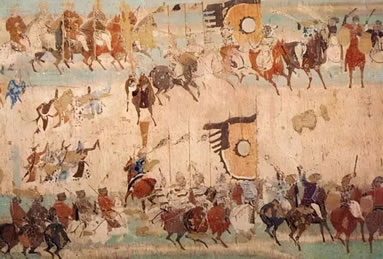 敦煌作為中西交通的樞紐,在壁畫上不僅留下了商旅來往的活動情況,還留下了寶貴的交通工具的形象資料。他們有牛馬駝騾、驢象舟船、車轎輿輦等。常用的交通工具車輛類型各異,牛車有“通牛車”、“偏牛車”、敞篷牛車,馬車有駟車、駱車,還有駱駝車、童車、獨輪車等,特別是保存了中國為世界交通做出獨有貢獻的獨輪車、馬套挽具(胸帶挽具和肩套挽具)、馬蹬、馬蹄釘掌等珍貴的圖像數(shù)據(jù)。西魏第285窟、北周第296窟五百盲賊皈依故事畫,表現(xiàn)了騎著戰(zhàn)馬的騎兵,與身穿褲褶的步兵(強盜)作戰(zhàn)的場面,畫面上畫出了馬鎧,它是保護戰(zhàn)馬的防護裝備,古稱具裝,或具裝鎧。第285窟馬鎧的形制齊全,從保護馬頭的“面簾”、到保護馬鞍后尻部的“寄生”一應(yīng)俱全。反映了漢代已有的具裝,到北朝時期已發(fā)展為玩唄成熟的保護裝備。馬鎧的產(chǎn)生和發(fā)展是中國為世界軍事裝備所作的獨有貢獻。