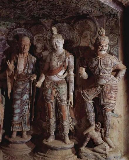 (1)早期——發(fā)展期,包括十六國、北魏、西魏、北周四個時代,歷時一百八十年。早期洞窟形制有三:1.禪窟,塑像在正龕。2.方形或長方形殿堂窟,塑像置于正龕或南北壁列龕內(nèi)。3.中心柱窟,塑像置于長方形柱四面之龕內(nèi)。從佛像類別上分,有彌勒像、釋迦像和釋迦多寶并坐像,以表現(xiàn)的事態(tài)分,有說法像、禪定像、思惟像。中心柱四面多為苦修、禪定、降魔、成道等像,主尊兩側(cè)多有侍從菩薩,形成一佛二菩薩的格式。早期彩塑多以彌勒為主尊,這與當時傳自西域的彌勒信仰有密切關(guān)系。