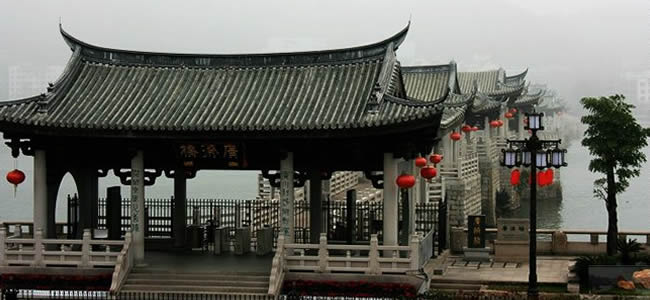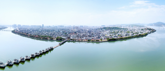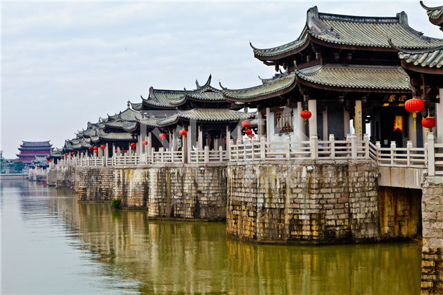 廣濟(jì)橋始建于南宋乾道七年(1171年);明朝嘉靖九年(公元1530年)形成“十八梭船廿四洲”的格局;解放前殘破不堪;1958年進(jìn)行加固維修,并拆除了十八梭船,改建為三孔鋼架及兩處高樁承臺(tái)式橋梁;2003年10月開始進(jìn)行全面維修,總體按明代風(fēng)格為修復(fù)依據(jù),功能定位為旅游觀光步行橋;2007年竣工。