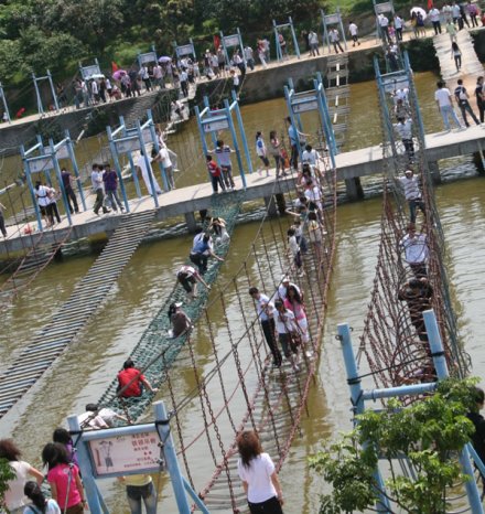 拓展訓(xùn)練基地占地面積10余畝,是深圳市青少年生存能力素質(zhì)教育基地,分為水上游樂區(qū)、高空拓展區(qū)與兒童游樂區(qū)。特別是水上游樂區(qū)涵蓋了霹靂滾桶、魔鬼車輪、木樁功夫橋和鐵鎖吊橋等有趣刺激拓展運(yùn)動項目。您既可以在青山綠水中盡情呼吸新鮮空氣,又可以在動感十足的拓展項目中挑戰(zhàn)自我,體驗這一風(fēng)靡全球的拓展運(yùn)動帶給你的無限快樂。項目網(wǎng)羅: 霹靂滾桶、魔鬼車輪、秋千橋 、連環(huán)獨(dú)木橋 、木樁功夫橋、 空中獨(dú)木橋、園木云梯橋、鐵鎖晃橋、長板坡 、 云梯橋 、鐵鎖鋼絲橋 、天羅地網(wǎng)、云梯功夫橋 、鐵鎖吊橋、 木樁功夫橋、水上漂 、鐵鎖橋、 一線鐵鎖橋 一線鐵鎖橋 、九曲獨(dú)木橋 、踏水無痕 、向風(fēng)起舞 、鐵甲四強(qiáng)等。