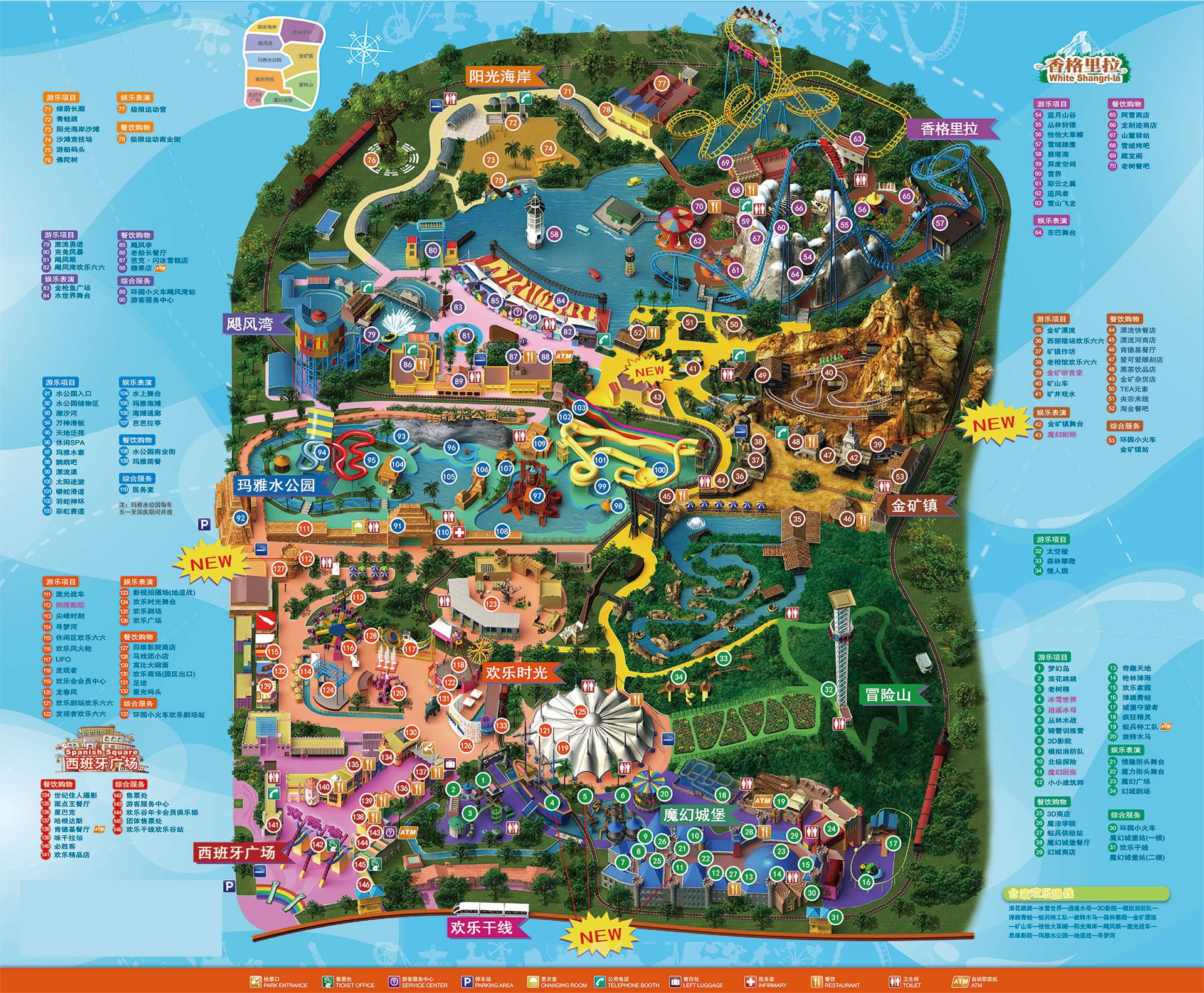 全公園共分八大主題區(qū):西班牙廣場(chǎng)、卡通城、冒險(xiǎn)山、歡樂(lè)島、金礦鎮(zhèn)、香格里拉森林、颶風(fēng)灣、陽(yáng)光海岸,加上奇趣的瑪雅水公園,有一百多個(gè)老少皆宜、豐富多彩的游樂(lè)項(xiàng)目。從美國(guó)、荷蘭、德國(guó)等發(fā)達(dá)國(guó)家引入眾多全國(guó)乃至亞洲獨(dú)有的項(xiàng)目:世界最高落差的"激流勇進(jìn)"、中國(guó)第一座懸掛式過(guò)山車(chē)"雪山飛龍"、中國(guó)第一座巷道式"礦山車(chē)"、中國(guó)第一座"完美風(fēng)暴"、中國(guó)第一輛"仿古典式環(huán)園小火車(chē)"、亞洲最高、中國(guó)第一座"驚險(xiǎn)之塔"--太空梭、亞洲首座集視覺(jué)、聽(tīng)覺(jué)、觸覺(jué)于一體的四維影院。這些游樂(lè)項(xiàng)目附以了逼真而完美的主題包裝,營(yíng)造出環(huán)境優(yōu)美宜人,具有美國(guó)西部和中國(guó)藏北風(fēng)格的景觀。一次次驚心動(dòng)魄的歷程,一個(gè)個(gè)撲朔迷離的故事,讓游客仿佛進(jìn)入一個(gè)亦真亦幻的神秘境界。