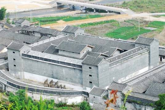 九棟十八井位于韶關(guān)市新豐縣馬頭鎮(zhèn)潭石村(新豐縣馬頭鎮(zhèn)G105國道旁與大廣高速馬頭出口交叉口西北側(cè)),始建于清康熙年間,占地面積2.5萬平方米,總建筑面積1.5萬平方米。九棟十八井為三進(jìn)院落四合院式布局,很有氣勢(shì)。建成橫三棟、縱三棟,名謂九棟,共有一百六十六間房屋;每三棟各有六口天井,共為十八井,故稱九棟十八井。建筑群由門樓、前院排屋、圍墻、主體建筑連接圍合而成,并內(nèi)設(shè)有書屋(已被毀)、水磨房、碾米房、織布房等。硬山頂門樓北向,門上石匾額陽刻“棣萼樓”;主體建筑群由三組建筑并列組成,中心組群為祖祠,左右兩組為支祠。三組建筑平面規(guī)制基本相同,是以廳堂為軸心,左右各配置天街、串屋,天街均向正面開門;祖祠正面兩角各設(shè)一角樓,二層,鍋耳山墻;左右支祠外角各設(shè)一角樓,二層,山字山墻。祖祠、支祠廳堂均三進(jìn),兩支祠進(jìn)深略短。其上中下三廳均為抬梁式木構(gòu)架,木構(gòu)件多有精美雕飾。該圍屋規(guī)模龐大,布局嚴(yán)謹(jǐn),外觀雅致,工藝精細(xì),雕飾精美,是新豐境內(nèi)保存較完整的客家圍屋,具有較大的歷史、建筑工藝等研究?jī)r(jià)值,2012年列入新豐縣不可移動(dòng)文物名錄。