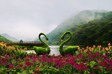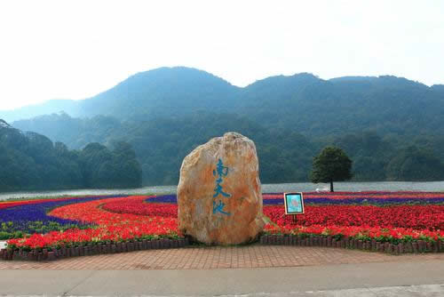 “七彩天池”花海是石灶風(fēng)光區(qū)的天池花海景點國慶期間的一個特色,由多種顏色的花卉共同組成。大紅色的一串紅、金黃色的硫化菊、紫色的千日紅、橙色的百日草、深紅色的紅穗冠、淡黃色的黃穗冠和粉色的朱唇等匯聚成一道亮麗的彩虹,降落在藍天碧水之間,創(chuàng)造出一個七彩斑斕的童話世界。同時,圍繞著這七色花海還有大波斯菊與醉蝶花。紅的,粉的,紫的,白的小花配以音樂等元素造型共同點綴著這幅優(yōu)美的畫卷!捌卟侍斐亍弊罴延^賞期為9-11月。