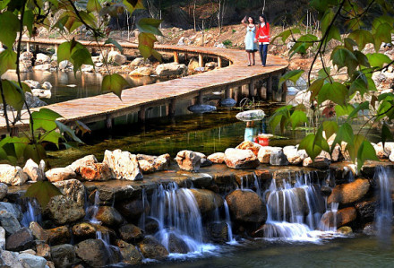 田園風(fēng)光區(qū)是公園為游客提供食宿、餐飲、娛樂、會議的場所。有近千畝名、優(yōu)、特、稀果樹品種,游客在進入公園其它景區(qū)前,就可以領(lǐng)略公園的田園風(fēng)光,在這里,游客也可以在不同季節(jié)直接到果園品嘗不同的名優(yōu)水果。在這里可以參觀古炮樓、虎神廟、蝠王洞天、偉人臥像、百丈飛瀑等景點。