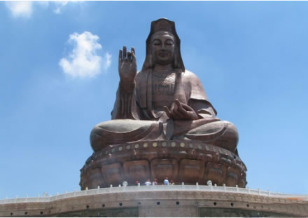 云海蓮臺(tái)地處西樵山風(fēng)景名勝區(qū)中心地帶,是以觀音文化為主題的大型景區(qū)。主要建筑有觀音法相、牌坊、影壁、放生池和浮雕等。觀音法相高達(dá)61.9米,是世界上最高的觀音造像。游客從北向入口,迎面聳立著一座六柱五門(mén)天柱牌坊,牌坊后隔著一個(gè)廣場(chǎng),建有影壁,用優(yōu)質(zhì)花崗巖雕筑,左右各設(shè)山門(mén),壁后刻有觀音六字真言,漢文由九華山住持、安徽省佛教協(xié)會(huì)會(huì)長(zhǎng)仁德手書(shū),藏文由西藏活佛親筆題寫(xiě)。影壁上還刻有韋陀法像。影壁后為一放生池,池旁圍以蓮花作雕的白石欄桿,跨過(guò)放生池上的石拱橋,沿著283級(jí)開(kāi)闊而整齊的石臺(tái)階,便可達(dá)觀音法像的蓮花座下。
