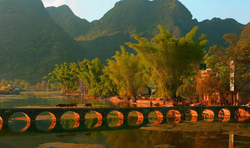鵝泉,與云南大理蝴蝶泉、廣西桂平西山乳泉并稱為中國西南三大名泉。是世界第二大跨國瀑布德天瀑布的源頭,位于廣西靖西市區(qū)南約5千米的小鵝山麓。因鵝山像一只鵝躺在泉水之上,故名。為國家AAAA級旅游景區(qū)。 古橋,建于清朝年間,橋長約60米,寬1.5米,全為石灰料石組成,是由15個涵洞的石拱橋組成,鵝泉古橋為靖西市保留得比較完整的古橋。