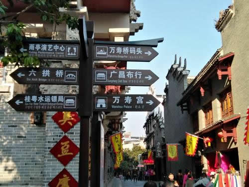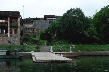 碼頭多用料石鑲砌,亦有因礁而設(shè)者。它們長(zhǎng)10余米,寬約3米,皆伸入江底,浮出水面,呈長(zhǎng)方形平臺(tái)狀。比起桂北一般圩鎮(zhèn)的碼頭來,它們顯得穩(wěn)重,大氣;若與武漢的江岸碼頭,北海的深水碼頭相比,則顯得小巧玲瓏,古樸秀美。它們順江排列,而兩者之間卻并不等距,具有一種錯(cuò)落感,富有美學(xué)價(jià)值。碼頭靠岸的一端,多連有一段平地,或古榕濃蔭,或龍亭飛角,或丹桂飄香,或鳳竹搖曳,兼有實(shí)用和觀賞價(jià)值。碼頭與鎮(zhèn)區(qū)均有巷道相通,依坡砌級(jí),石板鋪路,高墻夾擁,逼深邃,天光一線,給碼頭平添一種縱深感和活力。