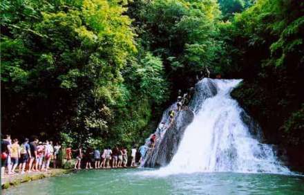 瀑布源頭比漓江水面高出180米,是我國(guó)唯一一個(gè)由地下涌泉形成的多級(jí)串連瀑布;是一個(gè)因鈣華沉積作用可逐漸長(zhǎng)高而改變景致的瀑布。八級(jí)瀑布形態(tài)各異,有的如鴛鴦戲水,有的如蛟龍噴水,有的懸于長(zhǎng)滿青苔的巖壁上,瀑水如布,水紋清晰可鑒,呈白色透明狀,猶如噴霧行云;有的水流集中下注跌入深潭濺起層層水霧浪花,猶如細(xì)雨蒙蒙,瀑布兩岸林木蔥郁,蔭蔽幽靜,水質(zhì)清洌,涼爽甘甜。山腳亞熱帶雨林濃郁,藤蔓垂壁,叢林險(xiǎn)徑,三千多畝的楓樹和馬尾松,風(fēng)吹林動(dòng),鳥語花香,令人有回歸自然的親切感。到了深秋時(shí)節(jié)的紅楓更是別一番“霜林盡染,漫山紅遍,紅葉鋪滿山徑”的美景。