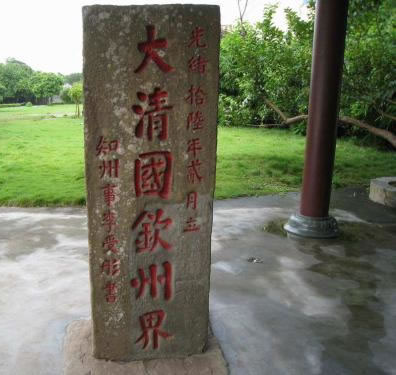 1885年6月9日,清政府與法國在天津簽定的《中法越南條約》規(guī)定,兩國邊界自竹山起,循北侖河出海口逆流而上,以河心為界線。防城港市與越南的邊界線,從竹山的北侖河口至峒中的北崗隘,長200多公里,全段以石碑為標志,共立1至33號界碑。竹山界碑是清光緒十六年(公元1890年)所立的第一塊界碑,故稱大清國一號界碑。100多年來,竹山一號界碑歷盡滄桑,屹立于北侖河口巋然不動,顯示了中國領土的神圣不可侵犯,故竹山一號界碑具有較高的歷史價值和現(xiàn)實意義。