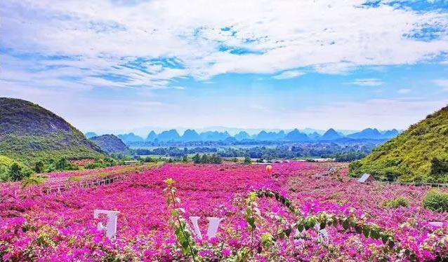 桂林花海景區(qū)位于臨桂區(qū)六塘鎮(zhèn)誠桂村委何家橋、黃家莊一帶,處于“桂林黃金旅游大通道”桂林—陽朔321國道中段,距離桂林30千米,交通便捷。景區(qū)由緊鄰桂陽公路的2000多畝青山峻嶺及峽谷300畝土地組成。