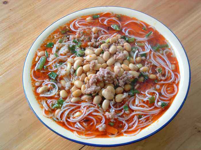 紅油米粉 紅油米粉是全州縣的傳統(tǒng)風味小吃之一,是本地人的早點,主要以:米粉、肉湯打底,紅油浮面,綠蔥點綴。