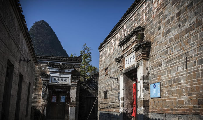 在明洪武年間,山東一位被貶的秦姓官員千里跋涉來到桂北地區(qū),據(jù)村民說,他們是唐代名將秦瓊的后人。后來秦氏的一支看中了水源頭村自周的山形地勢,于是選取了這個“風(fēng)水寶地”落下根基。經(jīng)過多年繁衍,漸成規(guī)模。在后籠山下,依山勢拾級而建成了成片的大宅子,當(dāng)?shù)厝朔Q其為“秦家大院”。這些宅子基本為三進(jìn)三開,房屋分為四組,組與組間隔兩米,形成狹長的巷道,均以青石板鋪筑。宅子的高堂、戲院、花廳都敞開大門,兩旁房子的大門朝里開,很有意思。宅子的墻壁都以幾噸重的青石方墩為基,砌上1米多后,改用青磚砌至屋頂,很獨特。高大敞亮的上層樓房,窗戶上鑲嵌的窗花是琉璃瓦燒制而成,上面還畫著花卉,溫婉中透著古色古香。房中的板壁上刻著各種花紋的圖案,庭柱下的石礅上鑿有龍鳳的花飾,精細(xì)美觀。