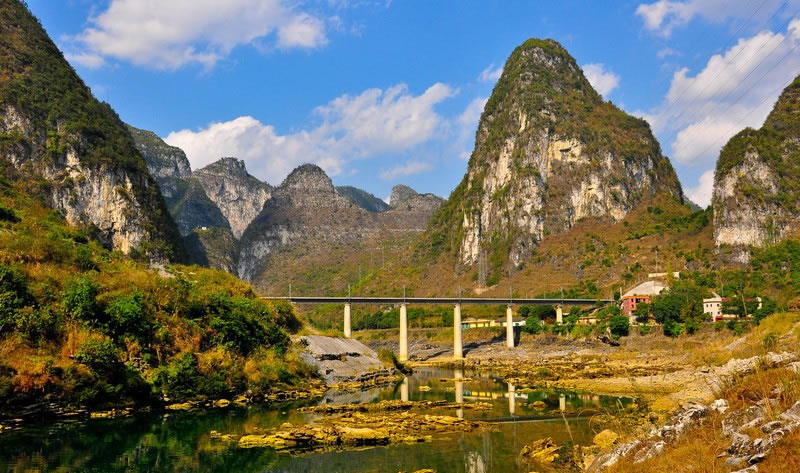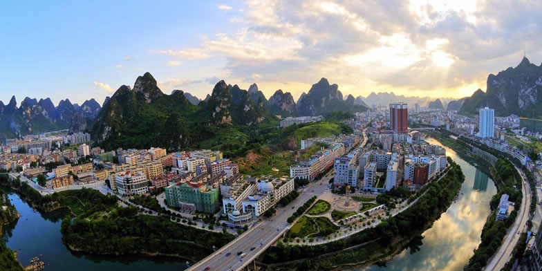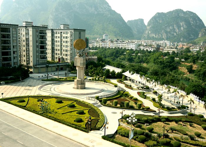 地理 金城江區(qū)系云貴高原余脈地帶,地勢(shì)自西北向東南傾斜,一般海拔為400-600米,最高海拔為1114米。屬桂西北邊陲要地,區(qū)境東界宜州市,西鄰東蘭縣,南接都安瑤族自治縣,北連南丹縣與環(huán)江毛南族自治縣。全境東西長(zhǎng)68千米,南北寬62千米,總面積2340平方千米, 耕地面積23.5萬(wàn)畝。